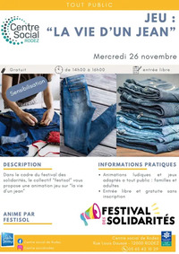 Dans le cadre du festival des solidarités, le collectif “festisol” vous propose une animation jeu sur “la vie d’un jean” !