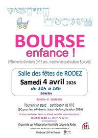 L’Association Familiale Laïque (A.F.L) du secteur de Rodez organise une BOURSE ENFANCE de vêtements d'enfants (0 - 16 ans), de matériel de puériculture et autres équipements. L'entrée est libre et gratuite pour toutes les personnes acheteuses Les personnes souhaitant tenir un stand individuel s'acquitteront de l'adhésion annuelle 2026 à l'association (10€) ou d'une participation de 5€ pour les adhérents à jour 2026. L'inscription se fera par téléphone ou SMS (06.43.97.76.86 et 06.37.72.22.32) ou par mail (afl.rodez12@gmail.com).