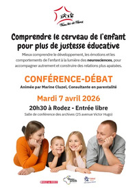 Dans le cadre de ses actions d'aide à la parentalité, l'association Familles de France Rodez organise une conférence-débat gratuite : le mardi 7 avril à 20h30 aux archives départementales sur le thème : Comprendre le cerveau de l'enfant pour plus de justesse éducative avec le concours de Marine Cluzel consultante en parentalité.
